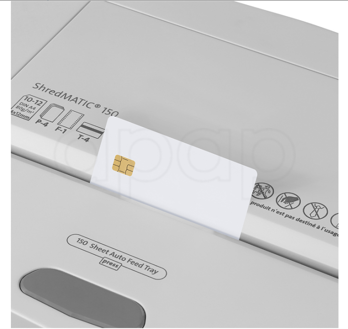 Nová generace skartovačky ShredMATIC 150, která kombinuje výkon, efektivitu a tichý provoz s kompaktními rozměry zařízení. Navržena tak, aby splňovala nejnáročnější požadavky moderní kanceláře. Výkonný motor a variace funkcí přináší rychlé a bezpečné zpracování dokumentů. S kapacitou manuálního podávání až 12 listů A4 najednou a automatickým režimem zpracování až 150 listů, je skartovačka ideálním řešením pro střední a velké kanceláře. Produkce řezaných částic o velikosti 4 ×12 mm odpovídá bezpečnosti P-4. Velkoobjemová nádoba na odpad pro dvakrát více skartovaného papíru. Režim „Stand by“ pro energeticky nízko náročnou spotřebu (<0,5 W). Vysoce tichý provoz – hlučnost v mauálním režimu 52 dB(A) a 38 dB(A) v automatickém režimu.