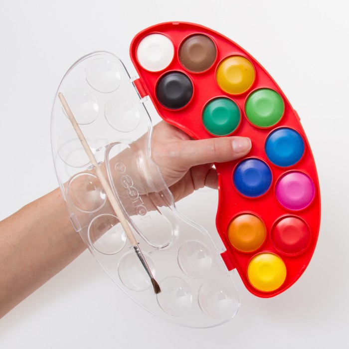 Intenzivní a zářivé vodové barvy s vysokou krycí schopností v unikátní obalu, který lze uchopit jako malířskou paletu. Praktické víčko s plochou pro míchání jednotlivých barev. Pevná struktura barev. Ideální do školy i pro volný čas.