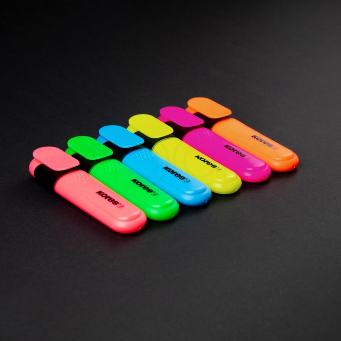 Souprava velkokapacitních zvýrazňovačů, klínový hrot. Vhodný pro psaní na všechny druhy papíru. Inkoust odolný proti UV záření. Pastelové odstíny - žlutá, růžová, oranžová, modrá, fialová, zelená.
